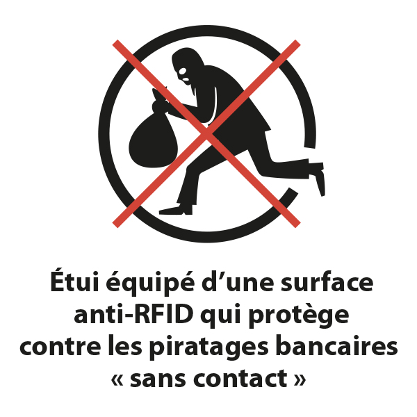 Etui cartonné, équipé d'une surface anti-RFID qui protège contre le piratages bancaires "sans contact"
