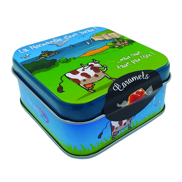 Boite en métal contenant des caramels fabriqués en Normandie